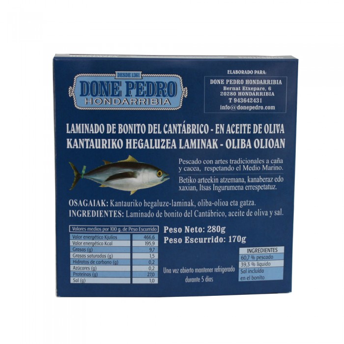 - Ingredientes: Laminado de bonito del Cantábrico, aceite oliva y sal.